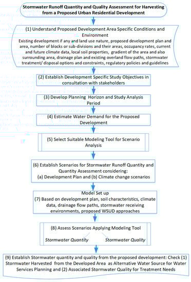 Considering the varying nature of urban developments in greenfield areas and learning from existing literature, a generalised methodology for the assessment of the stormwater harvesting potential and associated water quality for treatment needs was developed, as depicted in Figure 3. The methodology is described in the following steps: