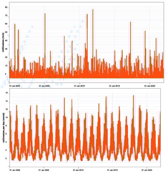 The recent 22-year record of daily rainfall and potential evapotranspiration (PET) data (2000–2021) from the Little River Station (station no: 087033) taken from Scientific Information for Land Owners (SILO) (https://www.longpaddock.qld.gov.au/silo/about/ assessed on 25 March 2023) is shown in Figure 4. The average daily rainfall depth and PET were 1.25 mm and 3.91 mm, respectively.