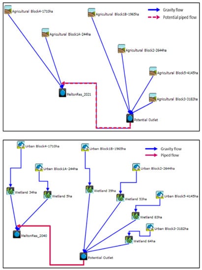 MUSICX model configuration of the Melton growth area under existing agricultural land use in the absence of the wetlands (top) and future urban development in the presence of the wetlands in 2040 (bottom).
