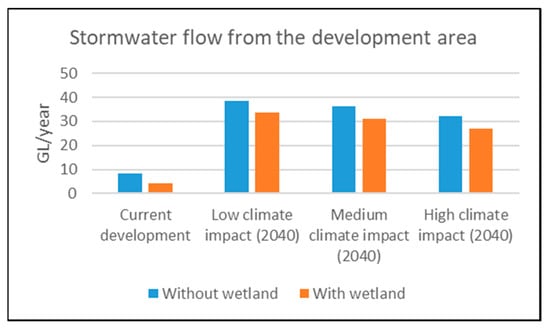 - Assuming no wetlands are constructed in the region, annual average stormwater volume increased to be 38.62 GL under the 2040 full urban land use with the low-impact climate. This decreased by 6% and 17% to 36.25 and 32 GL with the medium and high-impact climates, respectively.