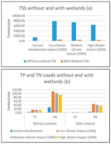 Table 7. Annual average pollutant loadings for each block under various land-use and climatic conditions in the absence and presence of the wetlands, with their removal efficiency. - The annual average loads of TSS were found to increase by over four times under the 2040 full urban land use with high climate change (most conservative scenario) compared with that of today. The same increasing trend occurred for both TP and TN, with larger loads of over three times in future urban development for the high-climate scenario compared with the existing agricultural land use (Figure 7a,b). This is likely due to the very high rate of stormwater runoff generated in all future cases than the default initial concentrations of the pollutant loads for current and future land uses. Even though the initial mean storm flow concentrations of the pollutants were higher for agricultural land use compared with urban-mixed land use (Table 5), higher pollutant loadings are expected for future urban scenarios as a result of the significantly higher stormwater volume generated in the future.