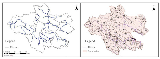 The preprocessed Digital Elevation Model of the source region of the Yellow River was used to extract the runoff network, and the total outlet of the Yellow River was defined as Tang Naihai Hydrological Station. The location coordinates of the cover hydrographic station were input into the model to divide the sub-basins of the water system. Then, the overall parameters of the basin were calculated, and the soil data, land use/land cover data, and surface runoff data were overlaid, and threshold values of the three thresholds to divide the hydrological response unit (HRU). In this paper, the water system is divided into 80 subbasins and 286 hydrological response units in the source region of the Yellow River (Figure 2). The measured runoff data from each hydrographic station can be used for parameter calibration and verification of the model after processing. The simulation time of the model is 1961–2013, in which 1961–1965 is the warm-up period of the model, and the verification time of the model is 2014–2019.