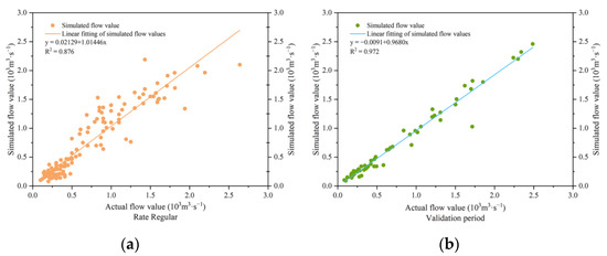 Scatter plot of simulated and measured monthly runoff in the source region of the Yellow River. (a) is the calibration period (1961–2013); (b) is the verification period (2014–2019).