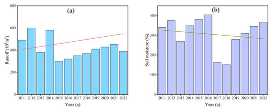 Figure 6a indicates that the surface runoff in the source region of the Yellow River shows an overall increasing trend from 2011 to 2022, but the interannual runoff increases or decreases more, and the runoff distribution is not uniform. It was the lowest in 2015 and started an increasing trend in 2016 to reach this 7-year high of 45.2 billion m3 in 2021. It starts to decrease again in 2022, down to 39 billion m3. According to Figure 6b, the soil moisture in the source region of the Yellow River showed an overall decreasing trend, reaching the highest soil moisture content in 2016. Soil moisture levels in 2017 and 2018 were the lowest in 12 years. Starting in 2018, the soil moisture content showed an increasing trend year by year.