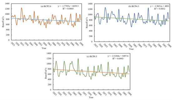 Interannual distribution of surface runoff under three scenarios. (a): Surface runoff in the RCP2.6 scenario; (b): Surface runoff in the RCP4.5 scenario; (c): Surface runoff in the RCP8.5 scenario.