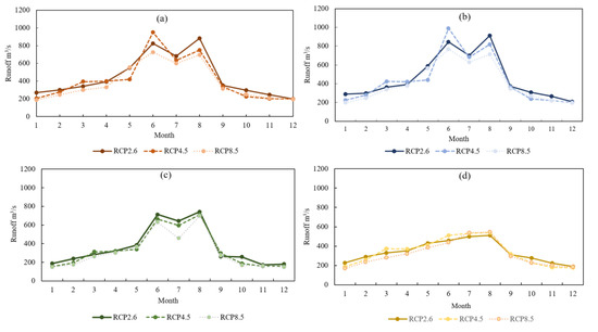 The annual variation trend of surface runoff is shown in the following figure (Figure 8). Under the three scenarios, the annual distribution of surface runoff had a certain amount of volatility. There were certain differences in the monthly runoff for different scenarios. The monthly runoff increased and decreased in RCP4.5 scenarios and increased the most and decreased the least in RCP8.5 scenarios. Under the three scenarios, the annual distributions of surface runoff in different periods were uneven. The net runoff from January to March showed a gradual increase and accumulation. The maximum runoff occurred in June and August, while the runoff decreased from September to December, and the minimum runoff occurred during this period. In January, February, November, and December, the overall surface runoff was on a downward trend. Compared with the middle of the 21st century, the reduction in surface runoff was larger than that in late 21st century. In the middle of the 21st century, the surface runoff from June to December accounted for about 65% of the annual runoff, while in the late 21st century, the proportion of the surface runoff from June to December in the annual runoff decreased to 60%. Both the 2040s and 2050s surface runoff peaks in June and August. And the 2050s surface runoff in June and August has a decreasing trend compared to the 2040s. The annual surface runoff in the 2050s will be smaller than that in the 2040s.