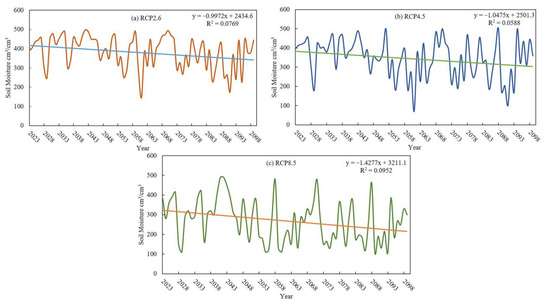 Interannual distribution of soil moisture under three climatic scenarios. (a): Soil moisture in the RCP2.6 scenario; (b): Soil moisture in the RCP4.5 scenario; (c): Soil moisture in the RCP8.5 scenario.