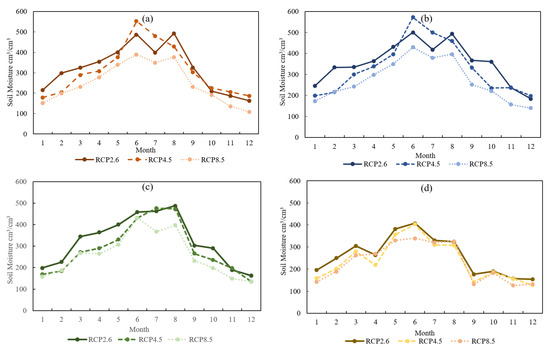 The annual distribution of soil moisture under the three scenarios. (a): The annual distribution of soil moisture under the three scenarios (2023–2100); (b): Soil moisture under three scenarios of 2040s (2041–2050); (c): Soil moisture under three scenarios of 2050s (2051–2060); (d): Soil moisture under three scenarios of 2080s (2081–2090).