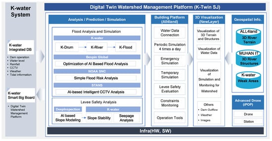 Based on this background, efforts to implement a digital twin platform have begun in the field of water management for better scientific flood control. Recently, the Ministry of Science and ICT and the National Intelligence Agency (NIA) in South Korea have launched the National Infrastructure Digitalization Project. As a part of this project, the K-water consortium developed a digital twin watershed platform for the Sumjin River basin [44,45]. The ‘National Infrastructure Digitalization Project’ is being carried out to strengthen national competitiveness and foster the Going Digital industry by leading its application to the nation’s major infrastructure.