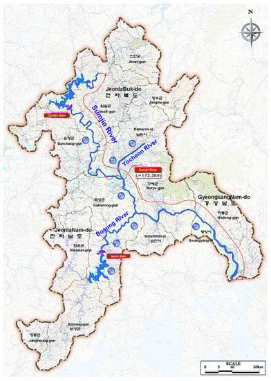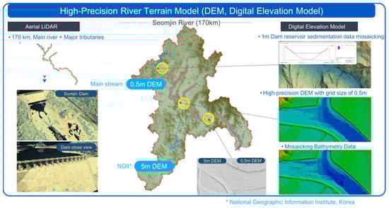 It is essential to visualize 3D geospatial information including topographic features and water infrastructure to build a digital twin platform for the entire Sumjin dam and river system. To visualize the real-world environment and assets in the digital world, it is necessary to acquire 3D geographic information and 3D models of structures. The Sumjin dam and river basin covers a vast area of about 4913 km2 with a 173 km long river (Figure 3). The geospatial information data for the fundamental river basin were obtained from authoritative sources, specifically the certified digital elevation model (DEM) with a grid resolution of 5 m × 5 m and the orthoimage with a resolution of 25 cm. These data were acquired from the National Geographic Information Institute (NGII), South Korea, a government agency responsible for providing geospatial information. However, since more high-precision data were required for river topography information to respond to floods, a separate aerial survey was conducted. In this project, an aerial LiDAR (light detection and ranging) survey and drone photogrammetry were applied [48].