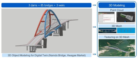 Various facilities affect the flow of water in the Sumjin watershed. Typical examples are dams, river crossing bridges, and weirs. Photogrammetry-based reality modeling was performed for the Sumjin dam, bridges, and weir structures. Drone photogrammetry models were created for three dams, 85 major river bridges, and three weirs in the watershed. Afterward, separate data reduction and simplification sketches of 3D models were conducted to upload them on the digital twin platform.