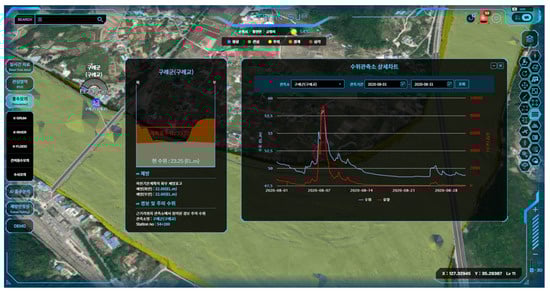 Hydraulic and hydrologic water management data are linked to the GIS-based 3D geospatial information (Figure 6). Water management data connected to the digital twin platform include dam operation, weather, river monitoring, and CCTV images. More specifically, real-time synchronized data include dam operation data (e.g., reservoir water level, inflow rate, discharge rate, water storage), river water level, rainfall, and CCTV video. These data are also used as input for the flood analysis model. River water levels and CCTV images are visualized based on location. They are also displayed on a smart big board.