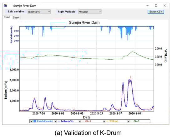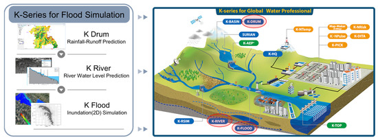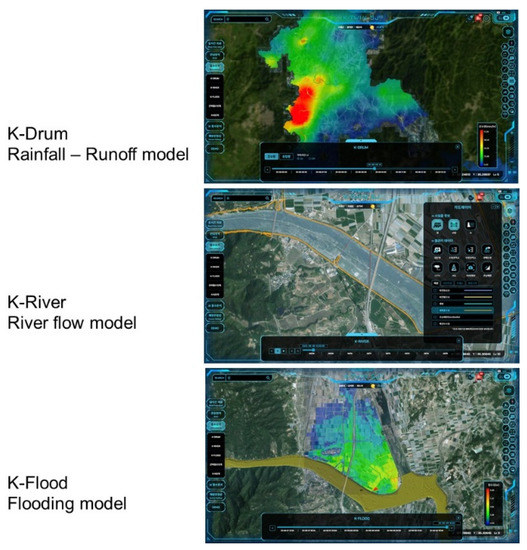 Flood simulation is a key feature of the digital twin watershed platform (K-Twin SJ). The platform is configured to perform a flood analysis by linking dams and rivers into one system. For the flood analysis, three types of software were installed: K-Drum for rainfall-runoff analysis, K-River for river flow analysis, and K-Flood for river overflow analysis (Figure 8 and Figure 9). These flood simulations are designed to be performed based on sensing data such as the real-time water level and dam operating conditions combined with geospatial information. In addition to current conditions, it is possible to simulate the flood analysis according to forecast scenarios when weather information or dam operating conditions change.