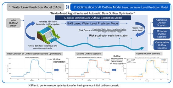 In addition, the flood simulation module is equipped with a function to predict the river water level according to the dam operation scenario based on the AI learning model and to optimize the decision-making on the dam discharge rate through the spillway. For the AI flood analysis, a smart flood prediction scheme was developed by applying the BAS model (big data, AI, simulation). This model creates a hypothetical model using flood-prediction-related mathematical/hydrological knowledge and 3D geospatial information and increases the accuracy of flood prediction data through model learning linked with the collected data (Figure 10).