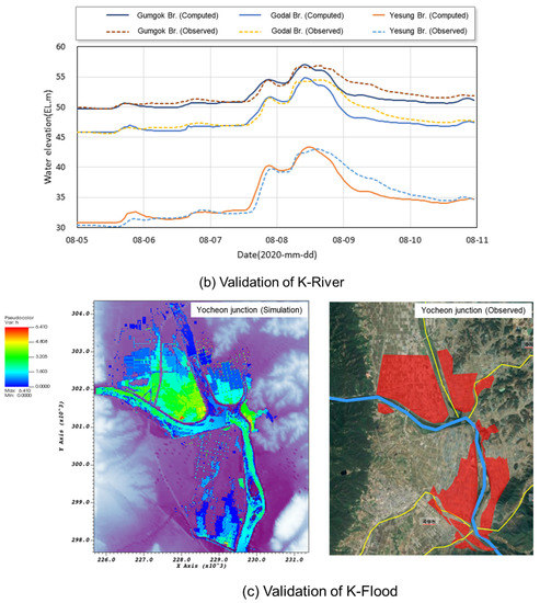 To ensure the reliability of constructing the digital twin flood simulation model, validation was conducted using the flood record of the Sumjin River in August 2020 (Figure 11). The validation process involved comparing the data from the main observation points with the predicted results obtained from the digital twin. Specifically, the accuracy of the K-Drum rainfall-runoff model was evaluated by calculating the inflow of the Sumjin River dam, and its performance was assessed using Nash–Sutcliffe efficiency (NSE), which measures the model’s ability to match the observed data. The NSE value for this model was found to be 0.95, indicating a high level of accuracy (Figure 11a). Additionally, the river level prediction using the K-River model exhibited behavior that closely resembled the observed water levels at three major points with water level observation stations during the flood event (Figure 11b). Furthermore, the K-Flood model, a two-dimensional flood inundation model, produced similar results to the actual extensive flooding that occurred in the Youcheon confluence area (Figure 11c). Overall, the flood simulation performance on the digital twin platform demonstrated good reliability for the August 2020 flood event.