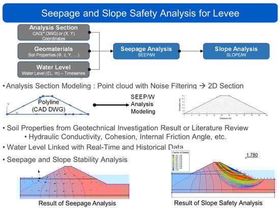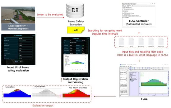 The levee safety evaluation module in this project comprises two analysis modules. One is a seepage and slope stability analysis module implemented by GeoStudio. The other is a slope stability analysis module by FLAC with a user-defined interface solution. By selecting levees in the weak area, the first module manually performs a slope stability analysis and a seepage analysis reflecting water level conditions. Through the slope stability and seepage analyses, the possibility of slope sliding and internal erosion of the riverbank is evaluated (Figure 12). The user can then upload the result to the digital twin platform. The second module does not conduct a seepage analysis, but rather it computes the factor of safety for the slope stability semi-automatically. Once the levee to be evaluated is determined with the geometry, input water level, and material properties, a FLAC controller searches for a pending analysis and automatically creates command input files using the built-in FISH language so that recalling FLAC can run the analysis (Figure 13). The output results, such as the factor of safety, saturation, displacement vectors, seepage distribution, and effective stress contour, are stored in the database and displayed on the platform. The whole process can be automatically performed on the platform, or the user can apply different material properties and river water levels as inputs when another slope stability analysis is necessary for a parametric study.
