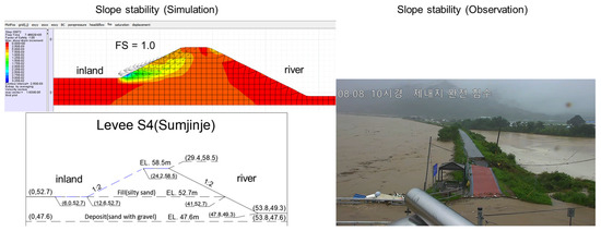 The validation of levee stability evaluation on the digital twin during flooding is a critical factor to consider. To assess the performance of the levee stability evaluation model integrated into the digital twin platform, we conducted validation for a specific levee section where slope sliding occurred in 2020. Figure 14 illustrates the occurrence of slope sliding on the levee during the August 2020 flood event. By utilizing the digital twin slope stability analysis, it was determined that the slope exhibited instability with a safety factor of 1.0, thereby confirming the occurrence of instability.