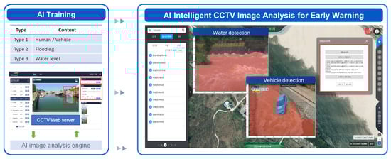 The platform contains an AI CCTV analysis system (Figure 15). It creates deep learning-based CCTV image analysis data that can be utilized to recognize and judge abnormal situations. By linking this with the digital twin, we are building a real-time system that quickly recognizes abnormal situations, supports comprehensive judgment, and enables preemptive responses. As types of object recognition, people, vehicles, and watermarks were trained. Two primary techniques are employed in AI-based intelligent CCTV analysis for the recognition of individuals, vehicles, and watermarks. The YOLOv4 model is utilized for the recognition of people and vehicles, while the YOLACT model is employed for watermark recognition. YOLOv4 is selected for people and vehicles due to the significance of object localization and the requirement for individual identification. In contrast, YOLACT is chosen for watermarks to bypass the localization step and treat them as a unified entity. The intelligent CCTV module achieves an image processing speed exceeding 1 fps, with object detection accuracy and watermark detection accuracy both surpassing 90%. In the future, this system can be linked with the early warning system.