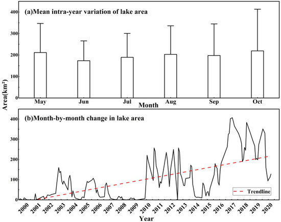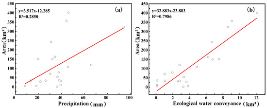 - Ecological water conveyance has significantly increased the area of Lake Taitema. Over the selected 20 years, ecological water conveyance expanded the area of Lake Taitema from 1.8 km2 to approximately 402 km2. The overall trend of expansion of the area of Lake Taitema is evident at both annual and monthly scales, and the lake began to expand after the head of ecological water conveyance reached it. This indicates that ecological water conveyance can alter the area of lakes.