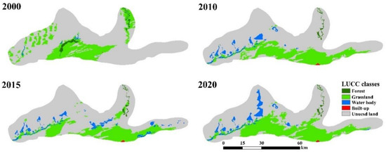 - From 2000 to 2020, significant changes occurred in the land use types of the Taitema Lake area, with an increase in grassland and water areas and a gradual decrease in unused land. The largest change in the proportion of unused land occurred over 20 years, with a decrease of about 9.6%, while the proportion of grassland and water increased by 6.0% and 4.4%, respectively. At the beginning of ecological water conveyance, the water area was very small, and the grassland was sparse. However, as ecological water conveyance progressed, the previously small lake area became a patchy lake, and the grassland became denser. This indicates that the spatial conversion of land use in the Taitema Lake area showed a trend of improvement due to ecological water conveyance.