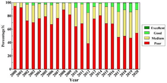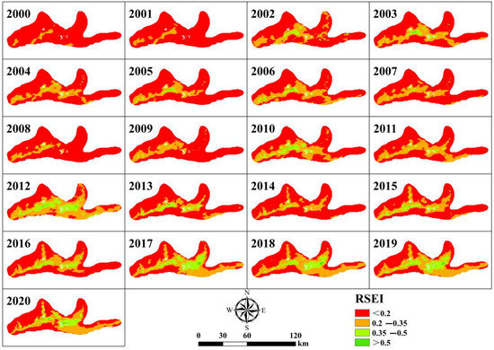 - Ecological water conveyance has gradually improved the habitat quality of Taitema Lake, and areas with poor ecological quality have been gradually replaced by areas with moderate, good, and excellent ecological quality. The Mann–Kendall test results show that over the selected 20 years, the proportion of pixels with an increasing RSEI ( > 0) in the Taitema Lake area was 56.5%, while the proportion of pixels with a declining RSEI ( < 0) was 43.5%, indicating a significant improvement in ecological quality in the Taitema Lake area over the selected 20 years. The change in ecological water conveyance was generally consistent with the change in the ecological environment. It is possible to see that ecological water conveyance plays an extremely important role in restoring ecology. In arid areas with scarce rainfall and insufficient water resources, the most direct and effective method to restore ecology is ecological water conveyance.