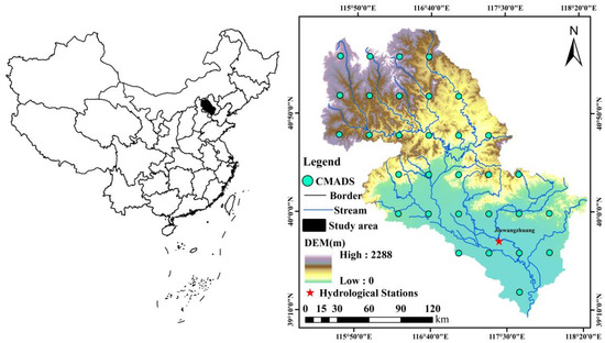 Furthermore, the runoff simulation also suffers from the complexity of the terrain and the fact that the river channels and basins extracted based on the original DEM do not match the reality and that the sub-basins are not reflective of the actual conditions within the basin by ArcSWAT itself. The catchment area threshold is the minimum catchment area required to support the permanent existence of a channel. The catchment area threshold directly determines the partitioning of sub-basins within the basin, the sparseness of the river network, and the generation of hydrological response units. As the catchment area threshold varies, the extracted hydrological features vary considerably. More factors are considered for the spatial variation in the basin topography, and the soil elements also change. Since the accuracy of the model prediction results depends to some extent on the description of the relevant characteristics of the watershed by the input spatial variables, the optimal catchment area threshold of the SWAT model can, to some extent, provide a reference for reducing the uncertainty of the simulation results [31]. Xing et al. [32] and Seyler et al. [33] showed that the delineation of the river network was affected by the DEM accuracy. The raw data determine the DEM accuracy and cannot be changed much after the data source is determined. Therefore, the river network can be delineated appropriately by selecting the optimal watershed area threshold to improve the simulation results’ accuracy. This paper used the CMADS-driven SWAT model [19] to extract the river network under different catchment area thresholds for reasonably classifying the Jiyun River basin. Firstly, this paper addresses the lack of meteorological data in the study area by coupling the CMADS V1.1 dataset with the SWAT model. A quality assessment of the reliability and applicability of the CMADS dataset in the simulation of runoff from the Jiyun River basin is carried out and the applicability of the CMADS dataset is analyzed. The paper then focuses on the changes in river network density caused by catchment area thresholds and analyzes the effect of subcatchment delineation on model simulation results under different catchment area thresholds. Reasonable catchment area thresholds for the SWAT model are explored. The CMADS-driven SWAT model applied to the runoff simulation to determine the catchment area threshold provided a theoretical basis for a reasonable sub-basin division in the Jiyun River basin and technical support for flood control and resilience.