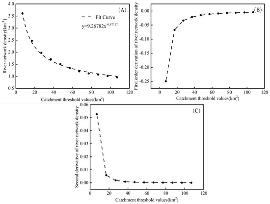 Variation in river network density (A), first−order derivatives of river network density (B), and second−order derivatives of river network density (C) with catchment thresholds.