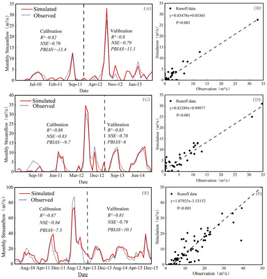 Hydrographs and scatter plots of the model calibration and validation for Jiuwangzhuang (A,B), Erdaozha (C,D), and Haihezha (E,F) hydrological stations.