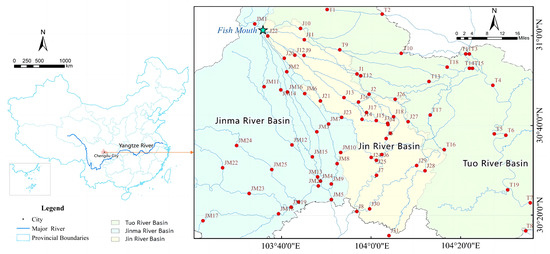 Chengdu straddles two water systems: the Min River and Tuo River. The Min River, which was once considered the Yangtze River’s main tributary, is divided into the Jinma River Basin and Jin River Basin at the Dujiangyan Fish Mouth (i.e., part of a famous ancient water project). Since ancient times, fish mouths have provided a steady flow of water to Jin River throughout the year, thus facilitating agricultural irrigation and preventing floods. Excess water tends to flow toward the Jinma River, which is mainly used for flood discharge. Although the Tuo River has its own water system, it actually draws water from the Min River. Notably, the Jinma, Jin, and Tuo River Basin account for 44.43%, 15.94%, and 39.63% of the total watershed area, respectively [22].
