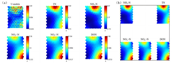 In this study, the multi-year average of 75 monitoring sections for 12 months (a total of 891 samples) was used as the data set. According to the minimum node volume of the competition layer (5 × INT()), the number of neurons in the SOM map was determined as 150 and statistical calculations were performed according to the data analysis method in Section 2.3.1. Figure 2a shows the U-matrix of the input dataset and visualizes all the parameters. The distance between neurons can be reflected by the U-matrix to determine the clustering structure of the SOM graph. The attribute value of the index parameters corresponding to each neuron can be expressed using color depth. That is, the neurons with higher TN and NH-N values were located in the upper and middle parts of the SOMs, and the neurons with higher NO-N, NO-N and DON values were located in the lower right part of the SOMs. Figure 2 shows that some neurons were not only polluted by NH-N, but also by NO-N, NO-N, and DON.