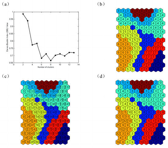 SOM clustering results: (a) relationship between the clustering number and DBI index, (b) clusters based on the lowest DBI index, (c) neuron numbers, and (d) number of samples in each neuron.