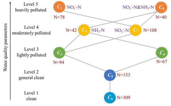 The advanced relationships among nitrogen properties (mass concentration) can be analyzed by determining the relationship between different elements. Figure 4 shows the elements () in each level of the Hasse diagram. and represent heavy NH-N pollution, while , , and represent heavy NO-N pollution. The nitrogen attribute values of and were low. Nitrogen pollution gradually increased from Level 1 to Level 5; however, the nitrogen attribute values between elements did not increase with a rise in level (Table 3). Specifically, Level 1 contains whose nitrogen attribute values are low. Level 2 contains , which is more nitrogenous than Level 1. Level 3 contains and , and its nitrogen properties are more profound than those at Level 2. Level 4 includes and ; shows higher TN and NH-N values, has higher NO-N values, and exhibits higher nitrogen attributes than those of the samples at Level 3. However, only increased the nitrogen attribute of at Level 3, which was lower than the NH-N value in . Level 5 contains and , which exhibit high nitrogen attribute values. The NO-N pollution of is dominant, while the NH-N pollution of is more prominent. only has an advanced relationship with at Level 4. The NH-N attribute of at Level 4 is higher than that of , while the nitrogen attribute of is higher than all elements at Level 1 to Level 4.