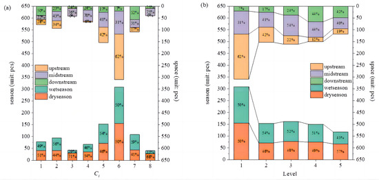 The nitrogen pollution of rivers in Chengdu, which is mainly driven by nitrate nitrogen, has been concentrated in the middle and lower reaches. Figure 5 shows the number and proportion of samples during the high and low water periods as well as the upper, middle, and lower reaches of the hierarchical clustering results. The nitrogen pollution at the upper, middle, and lower reaches in Chengdu changed significantly compared to the variations in nitrogen pollution in the high and low water periods. Samples that were moderately and heavily polluted accounted for 30.1% of the total samples, indicating that nitrogen pollution is still prominent. With increasing pollution levels, the proportion of dry season samples increased to 57.0%, the proportion of upstream samples decreased significantly, and the proportion of downstream samples increased significantly. The upstream samples that were moderately and heavily polluted accounted for only 14.9% of the total samples, whereas the proportion of downstream samples was 85.1%. Samples subjected to NH-N pollution were dominant in the middle reaches, and there were no upstream samples. Meanwhile, samples in the dry season were more than double the samples in the wet season. For NO-N pollution, the proportion of downstream samples was approximately 50%, and the sample size of in the wet season and dry season was similar. The number of samples in the wet season was more than that in the dry season, while contrasting results were observed for because of the significant NH-N pollution. Samples subjected to low-level nitrogen pollution were mainly observed in the middle and upper reaches, and the number of samples in the wet and dry seasons was equivalent. Overall, the nitrogen attribute values of most samples were low, and the number of samples affected by NO-N (25.4%) was much more than that affected by NH-N (9.2%).
