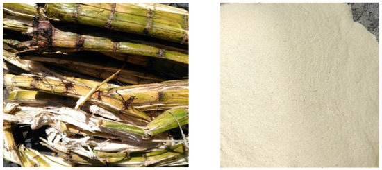 Untreated sugarcane bagasse (Figure 1) was used as an adsorbent; it was only washed with ultrapure water, dried in an oven (60 °C for 8 h), and ground. The triturate residue has a size particle of less than 0.4 mm. The characterization of sugarcane bagasse used in this work was presented in previous work [10].