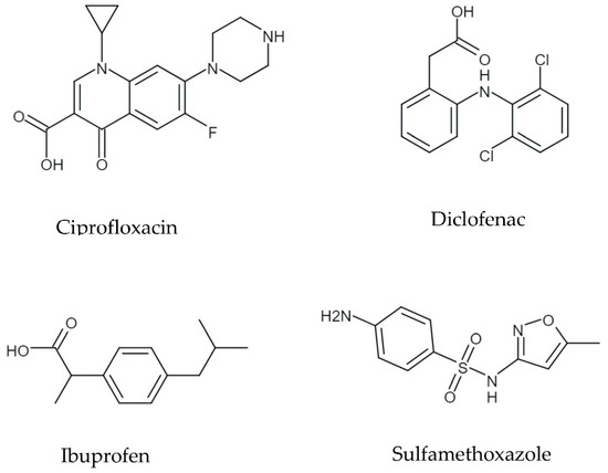 Pharmaceuticals such as antibiotics, analgesics, anti-inflammatories, and others improve life and reduce mortality caused by diseases. Thus, a wide variety of drugs enter the wastewater and natural water because of their manufacture and use in medicine and veterinary medicine. Their continuous administration has provoked a widespread occurrence of pharmaceuticals in natural aquatic ecosystems, with antibiotics and anti-inflammatory drugs being prevalent drugs [1,2,3,4,5].