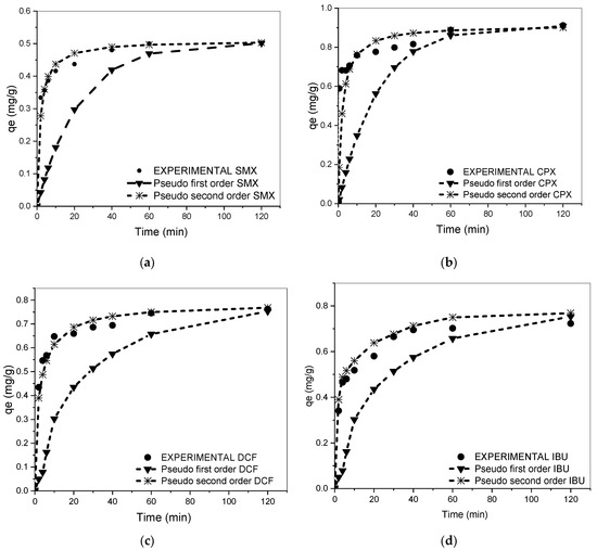Figure 4a–d show the experimental data fitted to the pseudo-first-order and pseudo-second-order models for each single solute. The best fit for each drug was with the pseudo-second-order model, with R2 values of 0.99. The pseudo-first-order model fit was unfavorable, as shown in Table 3.