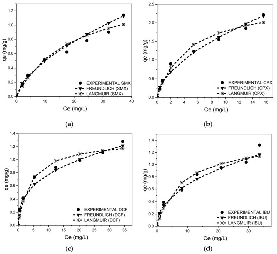 Figure 5a–d show that the isotherms of all drugs are similar. The isotherms correspond to the Giles L3 type [33], indicating favorable adsorption with multilayer formation, which had already been seen in previous works [9,10]. The steep slope of the initial part of the isotherm evidences the affinity between drugs and residues. The decrease in the initial slope is due to the difficulty of the solute to find active sites on the adsorbent when its concentration increases, mainly due to the competition between the adsorbate and the solvent [33,34]; the subsequent increase in the slope indicates the formation of a multilayer since the adsorbed molecules facilitate the adsorption of new molecules by an adsorbate–adsorbate relationship.