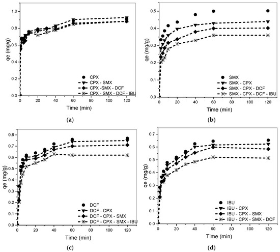 The adsorption capacity of CPX remained almost constant in the binary, ternary, and quaternary systems (Figure 6a) decreasing only 5% in ternary and quaternary mixtures. In the presence of the other pharmaceuticals, the CPX adsorption was similar to the system of CPX singly, i.e., 0.98 mg/g, indicating a high affinity for CPX [10]. The time required to reach equilibrium did not vary with the presence of other solutes.