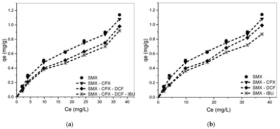 Figure 7a shows the isotherms of SMX in the presence of other drugs. A decrease in the SMX adsorption in all studied simultaneous systems capacity can be observed. Figure 7b shows the influence of CPX, DCF, and IBU on the adsorption of SMX. The amounts of SMX adsorbed on SB in the binary system decreased as follows: SMX singly > SMX with CPX > SMX with DCF > SMX with IBU. CPX had a lesser influence on the adsorption of SMX. The adsorption capacity decreased from 0.51 to 0.49, which was due to the lower amount of SB required for CPX adsorption, leaving free active sites for SMX. The presence of DFC reduced the adsorption of SMX on SB by 21.5%, while the presence of IBU decreased the adsorption by 23%. This result demonstrates the competition for the active sites for all drugs and the similar affinity of IBU and DCF for bagasse. The decrease in SMX adsorption was stronger at high concentrations. The capacity of adsorption was reduced by 33%, especially in the presence of IBU. In any case, when increasing the concentration solution, the adsorption of each drug increased due to its adsorption in multilayers.