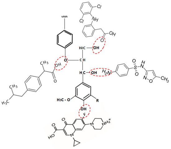 Lignin contains functional groups of hydrogen and oxygen that allow the formation of hydrogen bonds with drugs (Figure 8). Electronegative atoms of drugs (F, O, or N) form dipole–dipole bonds with the H of lignin and cellulose.