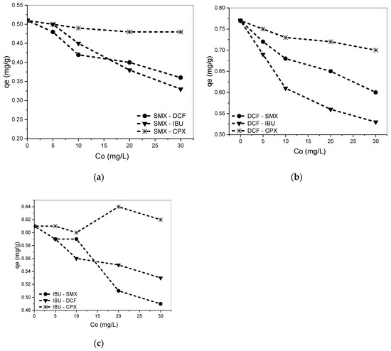 Figure 9 shows the competitive adsorption at different concentrations between SMX vs. CPX, DCF, and IBU (Figure 9a), DCF vs. SMX, CPX, and IBU (Figure 9b), and IBU vs. DCF, CPX, and SMX (Figure 9c).