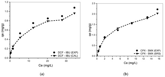 Figure 10a illustrates the experimental and calculated isotherms of the bi-component DCF–IBU system based on the SRS model with R2 = 0.94. The experimental and calculated CPX–SMX adsorption isotherms are shown in Figure 10b, and a value of R2 = 0.97 was obtained. Therefore, the SRS model was able to predict the studied bi-component adsorption of this work. The SRS model has been efficaciously used in fitting other bi-component systems such as caffeine–diclofenac [34]; 4-nitrophenol, and basic yellow 28 dye over montmorillonite [45], and 4-nitrophenol and 2-nitrophenol on activated carbon [46].