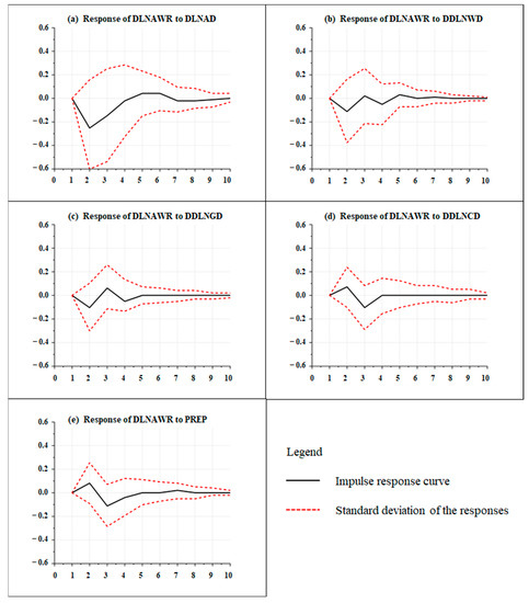 The ECM between AWRs and areas of LU and PREP was constructed through the analysis of the VAR model, as shown in Table 6 and Equation (10). In the short term, the influence of LU and PREP on AWRs in the YRB was significant. Under the condition that other variables remained unchanged, when AD increased by 1 unit, AWRs increased by 550.23 units. When the area of WD, GD, and CD increased by 1 unit, the AWRs in YRB decreased by 2041.71, 264.53, and 468.03 units, respectively, while when PREP increased by 1 unit, AWRs increased by 22.74 units.