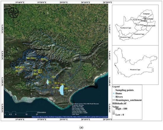 The Heuningnes catchment is situated in the Cape Agulhas Municipality, at 34°20″ and 34°50″ S latitude and 19°30″ and 20°30″ E longitude [10]. The catchment is 1401 km2 in size and includes the quaternary catchments G50B, G50C, D, E, and F (Figure 1a). Due to the poor aquifer condition of the Bokkeveld Group shale, the little water that is extracted from it typically has brackish or saline quality. This formation can be found in the catchment’s central region close to Elim village on the Agulhas Plain [11]. The Bokkeveld Group shale is covered by the Bredasdorp Group (Quaternary sediments) in the Heuningnes catchment, closer to the Soetandalsvlei Nature Reserve. The Bredasdorp deposits are composed of the tertiary and quaternary layers of unconsolidated to semi-consolidated, calcareous sands. The Bredasdorp Group’s shallow marine and aeolian sediments also contribute to the primary aquifer in the catchment (Figure 1b).