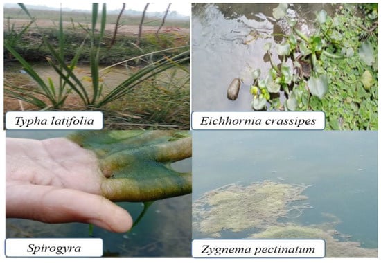 In the study, the algal species spirogyra spp. and Zygnema pectinatum were collected from the Khiyali River, Peshawar. The new buds of Typha latifolia (cattail) and Eichhornia crassipes (water hyacinth) were collected from the ponds in Sabi village, District Peshawar. The species were first washed with tap and distilled water. The algae were then observed and identified by the procedure adopted by [32]. To remove dust and sand, the selected species were washed thoroughly and acclimatized and transplanted into IWW for 40 days at room temperature (18–20 °C). Figure 1 shows the collection of hydrophytes and algae.