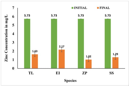 The average or mean of the Zinc concentration at the initial stage of the IWW was recorded as 5.73 mg/L. The mean Zn concentrations observed in the water samples collected after 40 days of the experiment from TL, EI, ZP, and SS were 1.63, 2.17, 1.02, and 2.24 mg/L, respectively (Figure 3). The efficiency of the Zn removal was noted as ranging from 60.90 to 82.19%, where 71.55, 62.12, 82.19, and 60.90% was removed by TL, EI, ZP, and SS, respectively, as shown in Table S1. The t-test results showed that TL, EI, ZP, and SS significantly (p ≤ 0.05) decreased the Zn level in the final stage water samples.
