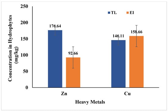 The study results indicated the highest uptake of Cu by EI, followed by TL. The analysis showed that Cu concentrations differed in various species. The Cu concentrations were observed to be higher in the roots as compared with the aerial parts of the hydrophytes. The findings of the study agreed with the literature on hydrophytes reported by Kumari and Tripathi [57], Victor et al. [58], and Galal et al. [59].