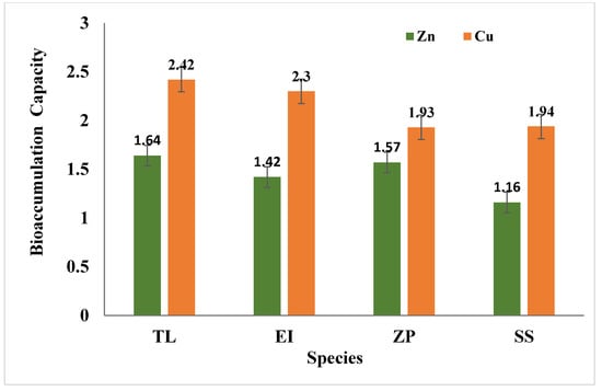 The translocation factor or bioconcentration factors determined for TL, EI, ZP, and SS for Cu were 75.99, 60.66, 72.79, and 73.35%, respectively. TL was recorded as having the highest and EI was recorded as having the lowest bioconcentration factor (Figure 6). Figure 7 shows the bioaccumulation capacities (q) of TL, EI, ZP, and SS for Cu, which were 2.42, 2.30, 1.93, and 1.94 mg/g. TL was observed as having the highest and ZP was observed as having the lowest bioaccumulation capacity (Figure 7). The bioremoval efficiencies recorded for TL, EI, ZP, and SS were 85.13, 80.78, 81.20, and 81.90%, respectively. The highest Cu bioremoval efficiency was determined for TL, and lowest was determined for EI (Supplementary Materials Table S1).