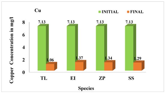 The comparative study of copper bioremoval efficiency, bioaccumulation capacity, and bioconcentration factors observed for hydrophyte treatment using TL and EI revealed that Typha latifolia was the most effective species for the remediation of Cu as compared with Eicchornia crassipes. Our study’s findings agreed with the study presented by Ayaz et al. [15], showing that Typha latifolia more effectively removed Cu from IWW compared with Eicchornia crassipes. Similarly, comparing the copper bioremoval efficiency, bioaccumulation capacity, and bioconcentration factors observed for algal treatments revealed that Spyrogyra species were the most effective species for Cu remediation as compared with Zygnema pectinatum.