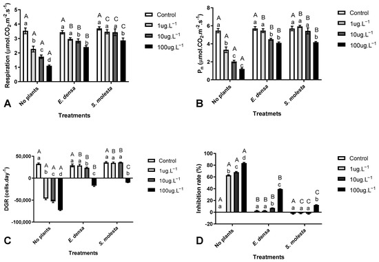 The effects of Cipro on primary metabolism and growth in Desmodesmus subspicatus cells exposed to water contaminated with Cipro at increasing concentrations (Control, 1, 10, and 100 µg L−1), with or without prior treatment using Egeria densa or Salvinia molesta plants. (A) Respiration; (B) Net photosynthesis rate; (C) Daily growth rate; and (D) Inhibition rate. The values are represented as the mean ± standard error of four replicates. Lowercase letters indicate significant differences in Cipro concentrations within the same treatment system, while uppercase letters indicate significant differences between treatment systems within the same Cipro concentration, as determined by the post-hoc Tukey test (considering p ≤ 0.05).